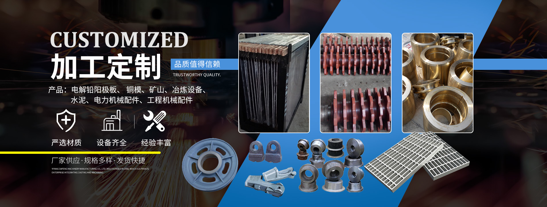 主要產(chǎn)品有:電解鉛陽極板、 銅模、礦山、冶煉設備、水泥、電力機械配件、工程機械配件